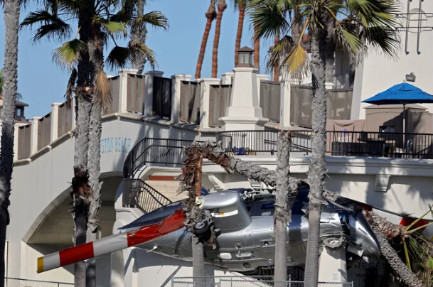 The helicopter was reportedly linked to the “Cars ’N Copters on the Coast” event scheduled for the following day. Shocking footage shared online shows the aircraft twirling in the air before crashing down between a building and several palm trees.